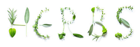 Medicinal Herbs on white background. Top view. Copy Space. Herb and Spices for cooking on white wooden background.