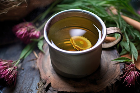 close-up of echinacea tea in a rustic mug by campfire, created with generative ai
