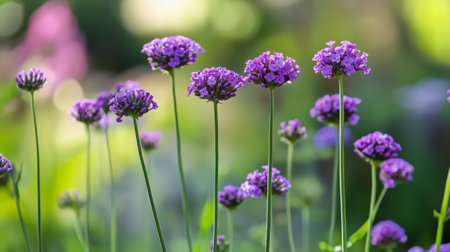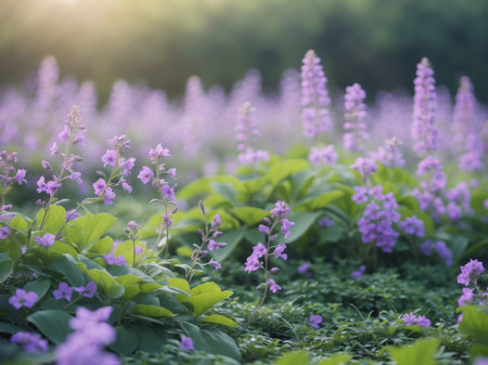 Purple flowering plants in a lush garden setting during sunny springtime creating a vibrant and serene atmosphere