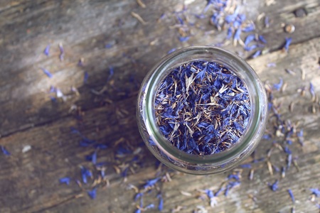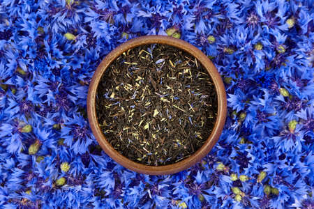 Cornflowers with black tea mix in a wooden bowl on blue flowers background, top view. Herbal tea cornflower buds.