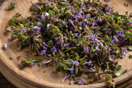 Minced fresh ground-ivy flowers on a cutting board, close up