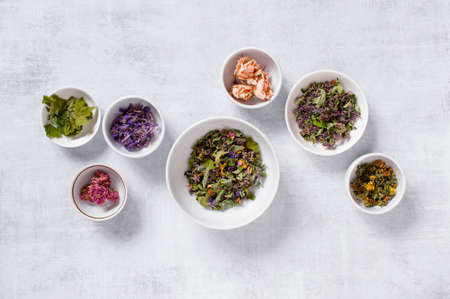 Tea herbs in bowls . flat lay.