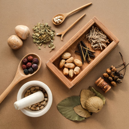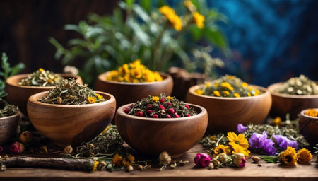 Wooden plates filled with folk herbs, alongside medicinal pots and cups, set against a dark navy blue background. A serene and elegant scene for health care advertising.