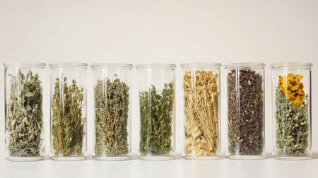 A visually appealing arrangement of assorted dried herbs displayed in glass containers, showcasing their natural colors and textures, perfect for culinary and wellness uses.