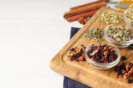 Different dry herbal teas on white background, flat lay