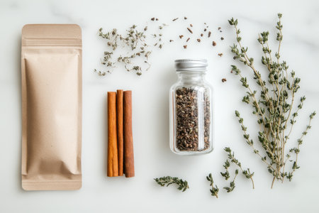 Thyme, cinnamon sticks, peppercorns and kraft paper packaging lying on marble table