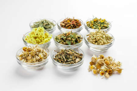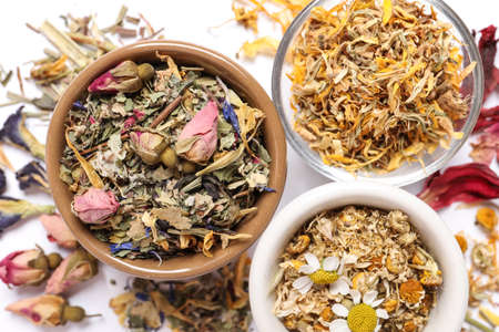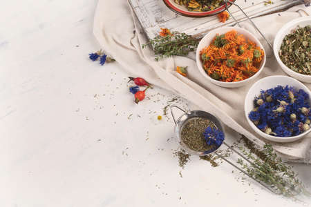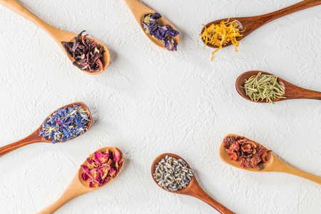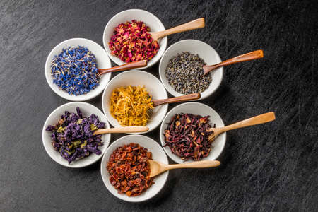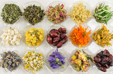 Set of dried herbs and flowers for brewing tea.