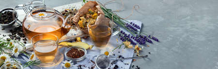 Organic tea panorama with herbs, flowers and fruit, shot from the top. Healthy hot drink panoramic banner with lavender and rose