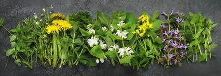 Edible plants and flowers on a dark background. Wild herbs as sources of carotenoids. Flat lay, top view, panorama