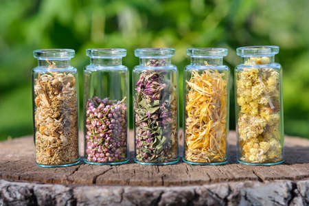 Glass bottles of medicinal herbs - daisies, heather, wild marjoram, calendula, helichrysum outside. Alternative medicine.