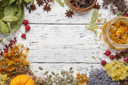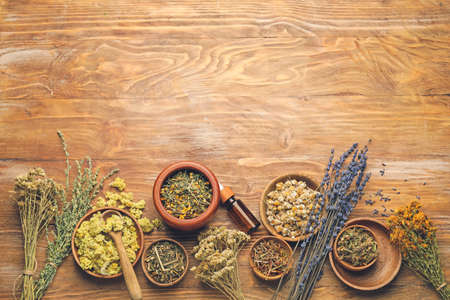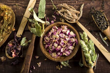 Dry medicinal herbs, plants, roots, ingredients for making of herbal medicine drugs, tea or infusion on wooden background. Alternative herbal medicine concept. Copy space for text.