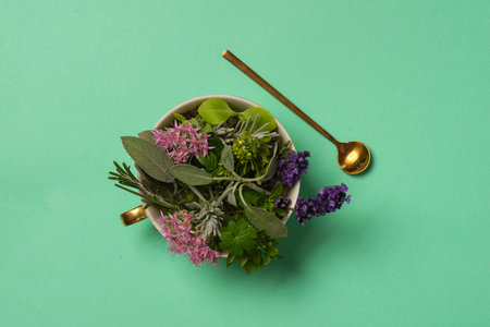 Natural herbal plant and flower remedies with herbs and summer flowers. Used in skincare for anti ageing benefits and can ease psoriasis, acne and eczema skin problems. On pastel green.