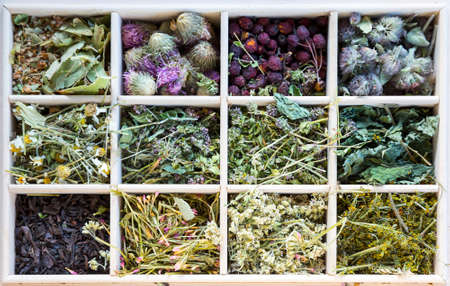 Assortment of dried tea in wooden box