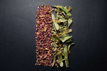 Top view picture of dried herbs arranged in the line, on the black background.