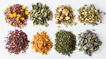 Explore a vibrant assortment of dried plants captured from a top down view. This beautiful arrangement showcases various herbs, spices, and petals, perfect for culinary uses or decorative purposes.
