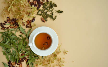 Top view herbal tea in a white cup for beauty and health, dried linden flowers, herbs and strawberries lie around.