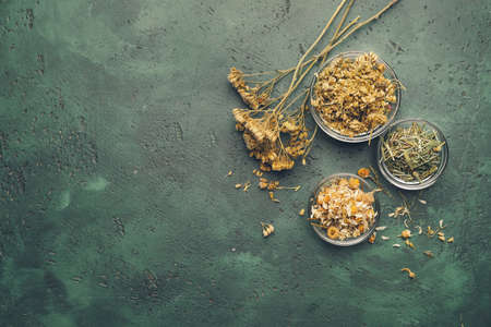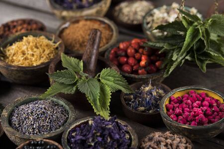 Bowls and jars of dry medicinal herbs on table. Healing herbs assortment. Alternative medicine.