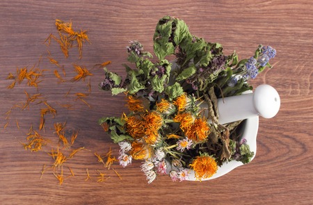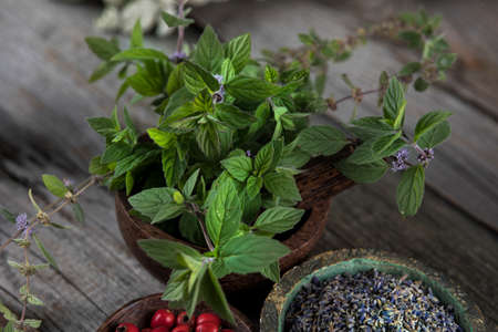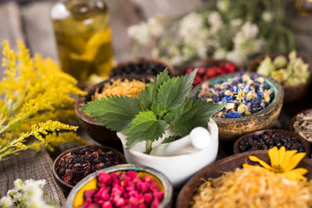 Fresh medicinal, healing herbs on wooden