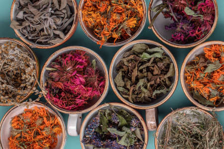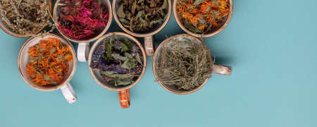 Assortment of dried relaxing tea herbs in colourful cups on blue background close up. Calendula, mint, anise hyssop, monarda didyma, wormwood, sage leaves.