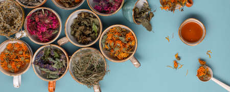 Assortment of dried relaxing tea herbs in colourful cups on blue background with honey close up. Calendula, mint, anise hyssop, monarda didyma, wormwood, sage leaves.