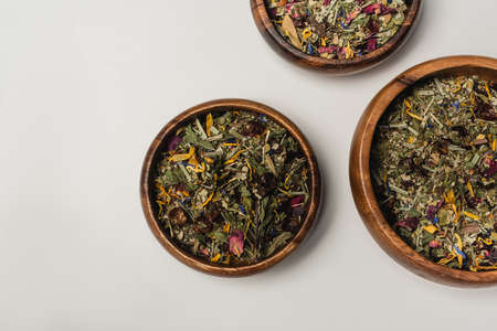 Top view of dry tea in wooden bowls on white background