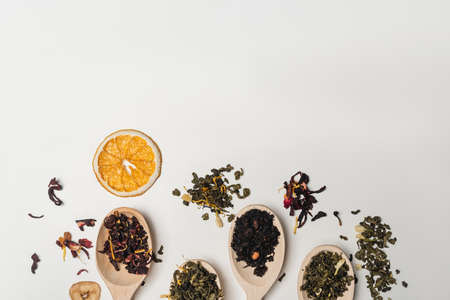 Top view of dry tea in wooden spoons near orange slice on white background