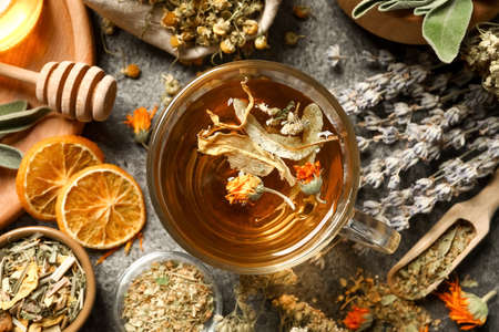 Cup of herbal tea with wild herbs and wild flowers