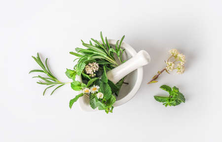 Medicinal herbs in mortar with pestle isolated on white background. Top view. Herbal medicine concept.