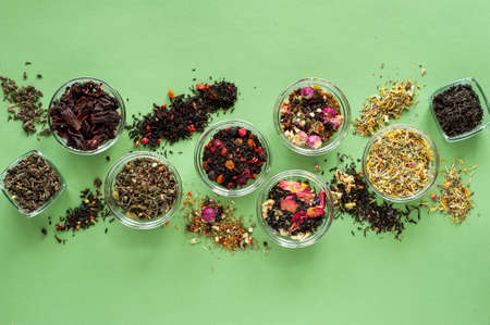 A set of different types of green, black and herbal tea on a green background. Delicious organic drinks. View from above.