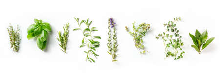 Herbes de Provence, French aromatic herbs panorama, overhead flat lay shot on a white background