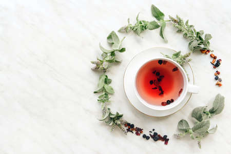 vertical hot tea on a wooden white background, the ingredients for the preparation of natural herbal tea. Melissa and mint, chamomile and currants, raspberries. morning in the village.top wiew.