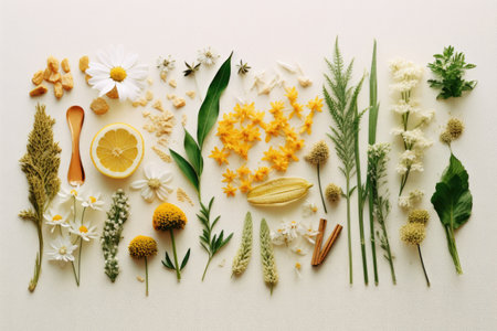 Modern flat lay style showcasing herbal medicine and cosmetic background