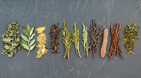 An elegant display of various herbs and spices arranged on a dark surface, highlighting their unique colors and textures, perfect for food photography and cooking inspiration.