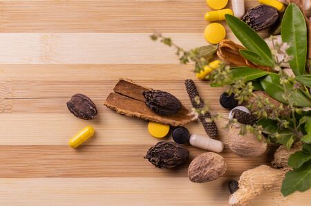 Herbal medicine concept. Assorted spices, ayurvedic medicines, tulsi leaves with seeds and green leaves scattered on wooden background