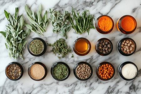 An assortment of fresh herbs and spices are presented in an organized and appealing manner on a marble countertop