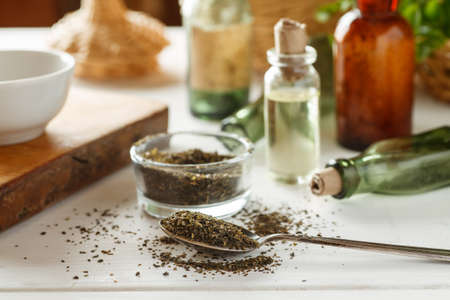 Tea in a metal spoon and vintage glass bottles around on a white table