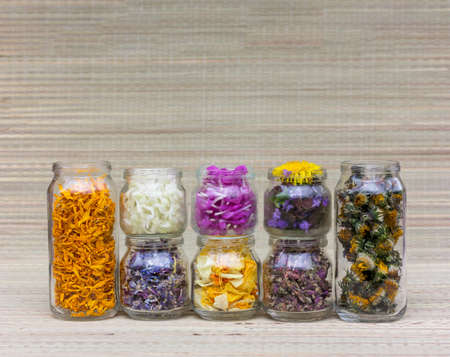 set of glass jars with different flowers, petals and herbs for aromatherapy and alternative medicine with copy space.
