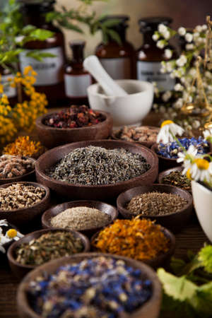 Alternative medicine. Herbs in bowls, mortar and medicine bottles on wooden rustic table.