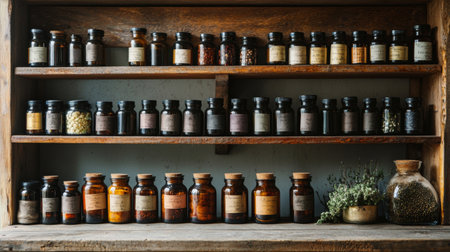 A vintage apothecary shelf with neatly arranged glass jars containing herbs and spices, exuding an old-world charm. Ideal for herbal, natural, and vintage themes.