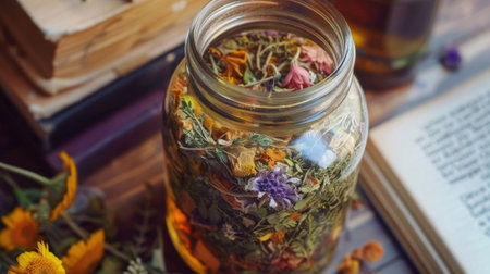 A rustic apothecary scene with glass jars filled with dried herbs, displayed on shelves, creating an old-world charm and evoking natural healing and holistic wellness.