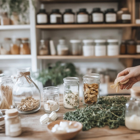 A person carefully adds herbs into a small glass jar filled with oil, surrounded by various containers of organic ingredients. The warm kitchen ambiance enhances the homeopathic process.