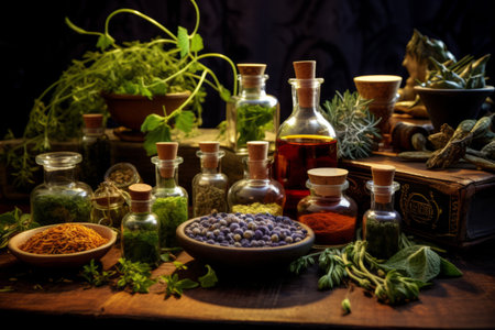 Herbal Apothecary with Natural Ingredients. A traditional apothecary setting with natural dried herbs, flowers, and various bottles, alternative medicine, herbal medicine and holistic healing