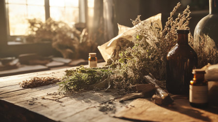 A serene scene featuring dried herbs and natural ingredients arranged on a rustic wooden table, captured in warm sunlight. Ideal for wellness and apothecary themes.