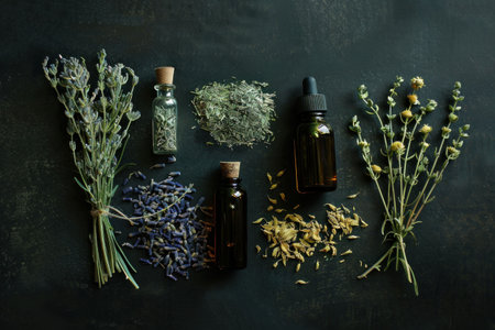 Aromatic herbs and essential oils arranged on a dark surface with natural elements