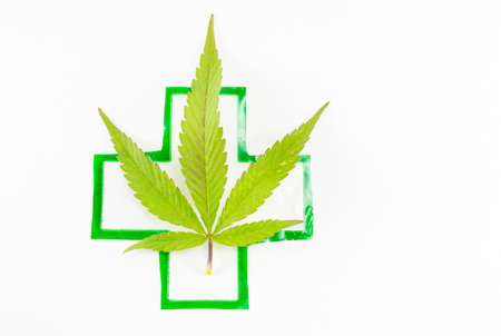 Cannabis plant and medical sign. Alternative medicine abstract
