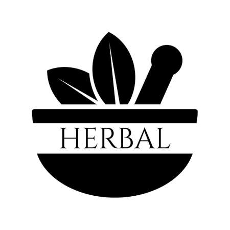 Vector simple icon with illustration and lettering, mortar with pestle, herbal collection or tea.