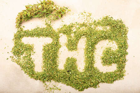 THC word inscription made from green cannabis buds
