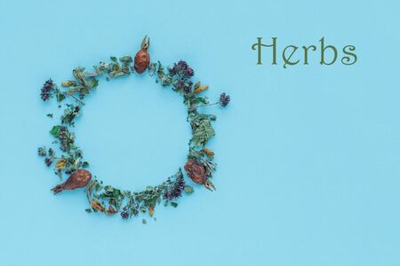 Creative herbs and flowers concept. Various herbs and flowers border on light mint background. Text. Word. Letters