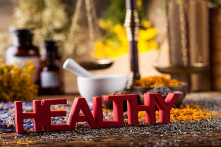 Word HEALTH spelled out with herbs and tea leaves