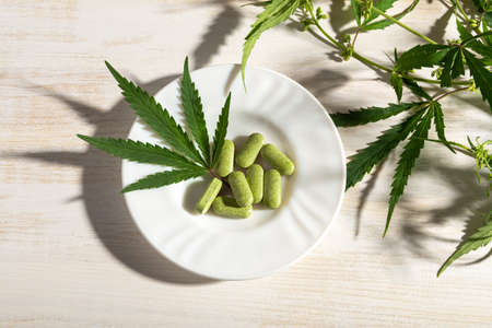 Prescription herbal pills of cannabis sativa weed and green marijuana leaf on a white saucer near fresh hemp stem with leaves over wooden table. Cannabis pills for alternative medicine. Top view.